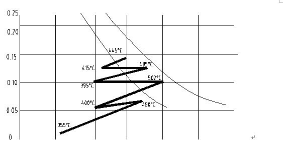 曲线分析:a、由于采用了间接换热的段间换热技术,第1、2床之间、第2、3床之间的反应气没有冷激冲淡,曲线平,最终达到氨含量提高之目的;b、第一床催化剂量较多,采用宽温区型(或高低温催化剂混装型的)的催化剂装填技术,达到第一床的反应温升最高,从而达到氨含量最高;c、较低的第2床、第3床的进入气温度(由于采用了层间换热器的进入气体分流进入的方式,使调温十分方便)较低的入气方式,提高了第2床、第3床的反应“推动力”;d、本曲线在运行过程中根据气体成份变化、气量变化、循环量的情况可现场操作人员十分方便地进行“再造”,从而达到优化操作之目的。